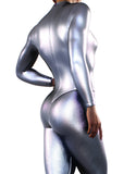 The shaping festive costume is designed from stretchy silver lycra with a metallic coating. Its inner lining has a thin layer of soft thin fabric to make it more appealing on the skin and comfortable for putting it on and off. It sculptures you around the hips and adds an extra push-up for the booty, the front pard visually narrows the waist and sucks in the tummy. This sexy one-piece bodysuit is among the most attractive and fantastic clothing pieces in your closet.