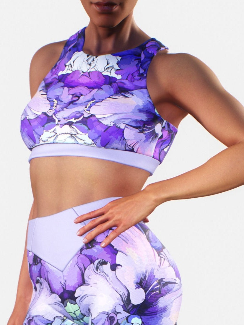 Peonies are lovely flowers and are a favorite to many of us but we all know their blossom's longlivity. To preserve the beauty of the flower we've created a Purple Peony Sports bra to go with the Purple peony printed leggings. You can almost feel the sweet scent when near your yoga pants!