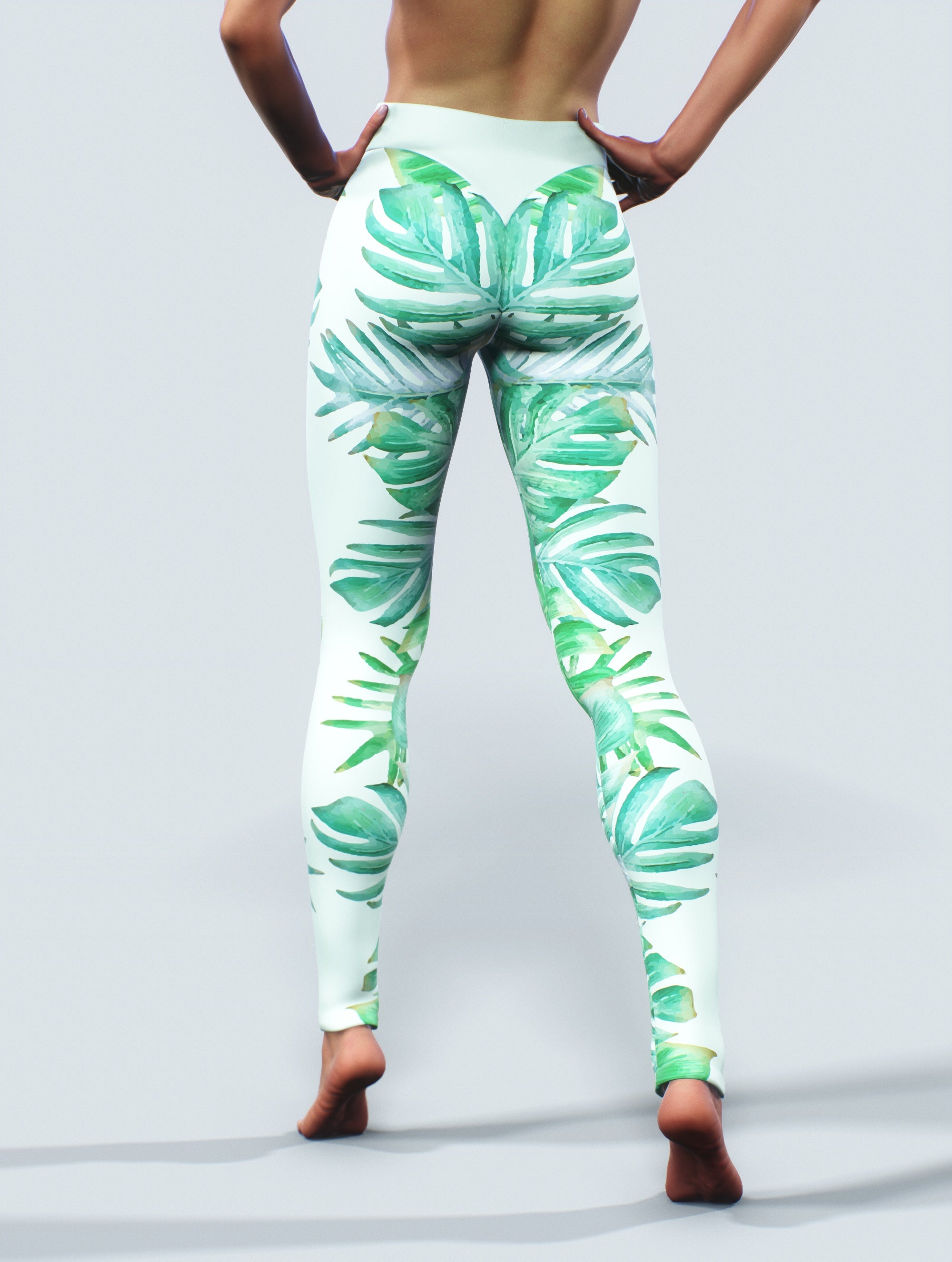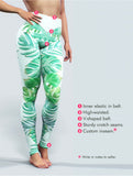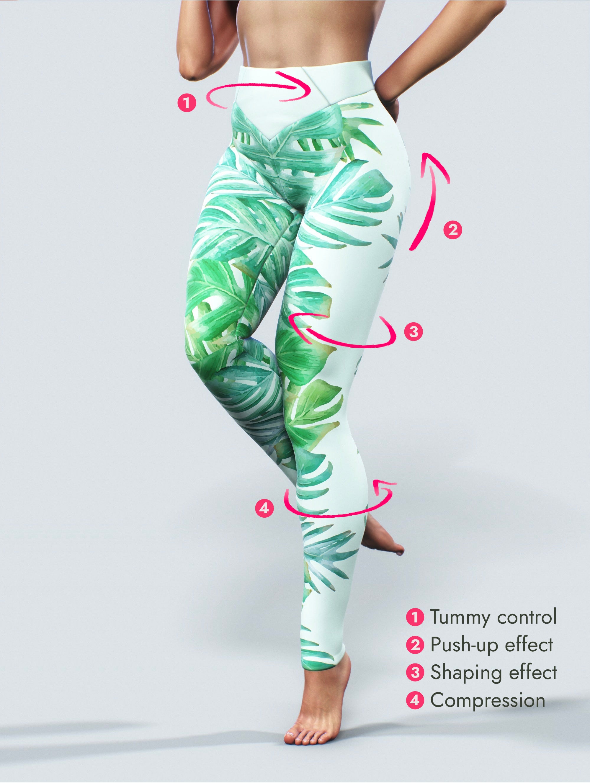 Booty Sculpted's Bird of Paradise leggings captures perfectly the warm, fresh, and invigorating green leaves of a palm rocking in the wilds of the Hawaiian Islands; clothing exhibiting a feeling that cannot be adequately described but must be experienced.